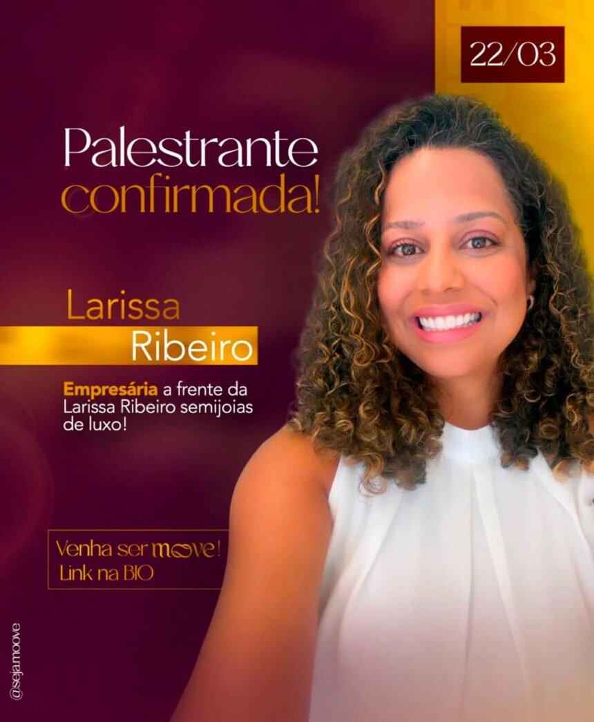 O MOOVE, mais do que um evento, é uma oportunidade de se conectar com mentes visionárias e adquirir conhecimentos essenciais para o sucesso no mundo dos negócios. Não perca a chance de estar frente a frente com Larissa Ribeiro e outros profissionais que farão parte dessa experiência única.