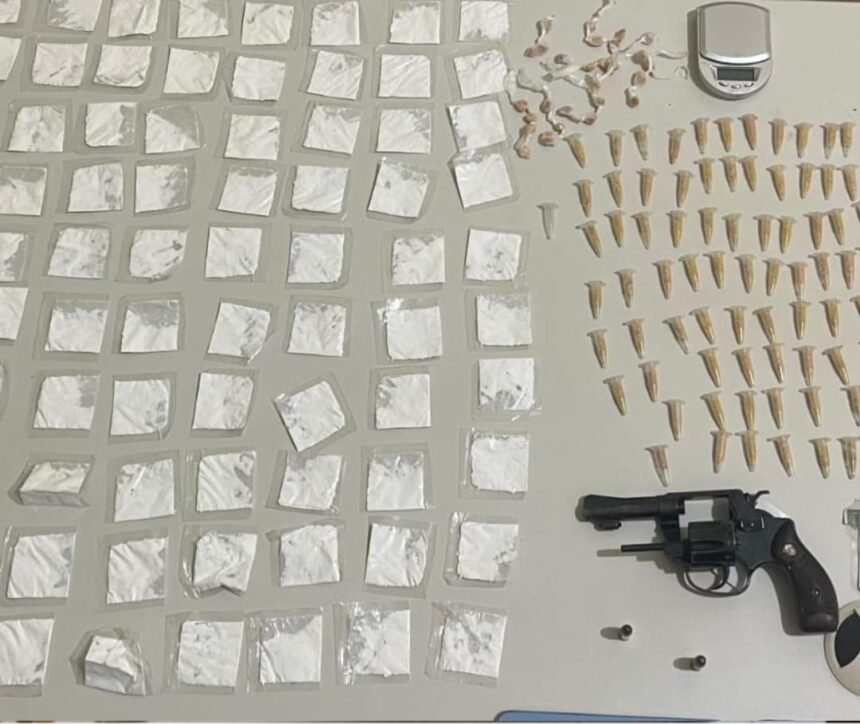 Após a abordagem, foram apreendidos um revólver S&W calibre .32 com duas munições intactas, 27 pedras análogas ao crack, 92 pinos contendo substância análoga ao crack, 81 papelotes de substância análoga à cocaína, uma balança de precisão, dois celulares e uma motocicleta Honda CG preta.