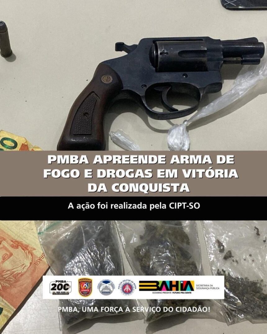Ao realizar a abordagem, foi encontrado em sua cintura um revólver calibre .38, além de uma pequena quantidade de drogas e dinheiro em suas vestes.