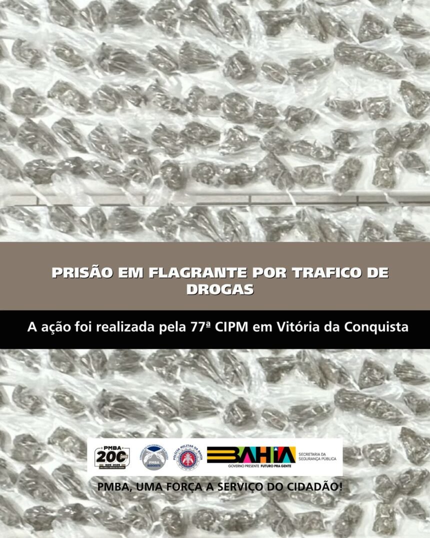 Por volta das 12h30 desta sexta-feira (28), durante patrulhamento tático no bairro Urbis III, na cidade de Vitória da Conquista, uma guarnição do PETO da 77ª CIPM flagrou uma mulher em posse de grande quantidade de substância análoga à maconha pronta para comercialização (2kg), além de balança de precisão e dois aparelhos celulares. Diante dos fatos, a nacional, juntamente com todo o material apreendido, foi apresentada ao DISEP, onde a ocorrência foi registrada.