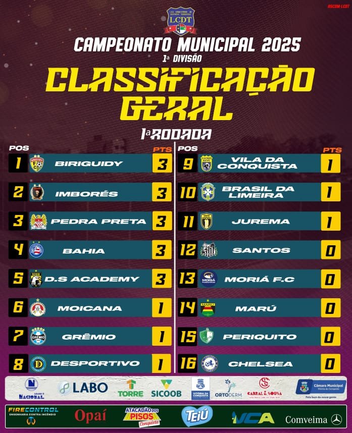 A bola já está rolando no Campeonato Municipal, e a 1ª rodada mostrou que a edição deste ano promete fortes emoções do começo ao fim. Com partidas movimentadas, torcida presente e muita entrega dentro de campo, as equipes deram o pontapé inicial na briga pelo título e a classificação geral já começou a se desenhar.