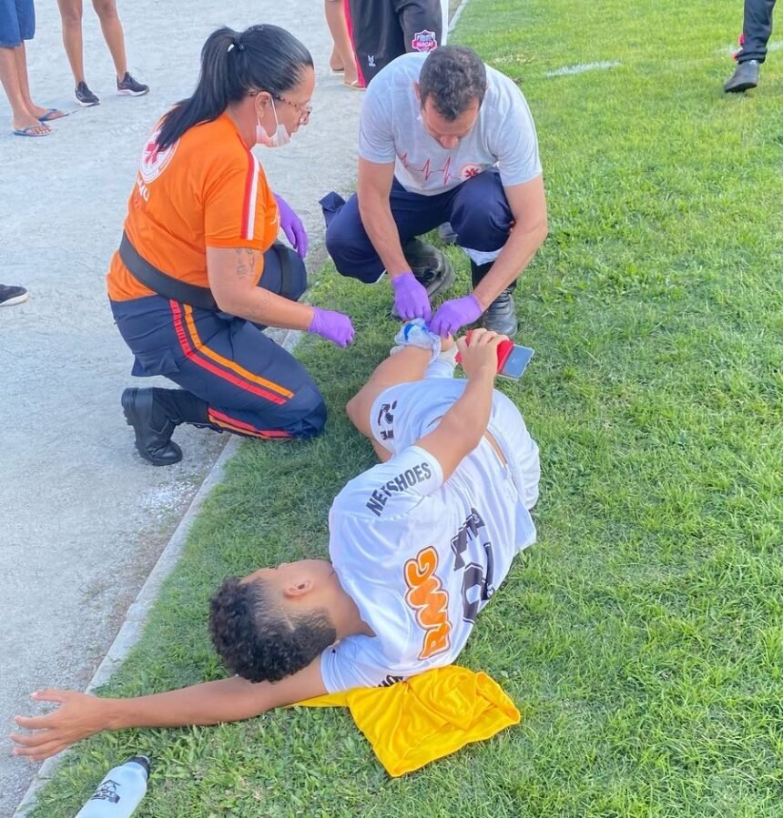 Na tarde deste sábado (12), o jogador Vitor da Silva, do time do Santos, sofreu uma lesão no tornozelo durante uma partida válida pelo Campeonato Municipal. O incidente mobilizou a equipe do Serviço de Atendimento Móvel de Urgência (SAMU), que prestou os primeiros socorros ainda no local do jogo.