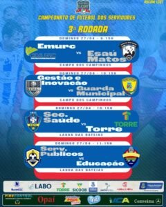 Futebol e Festa: Campeonato dos Servidores Retorna com Confrontos da Terceira Rodada Neste Domingo . Após a pausa durante a Semana Santa, a bola volta a rolar com força total no Campeonato dos Servidores. A competição, que tem mobilizado a comunidade e promovido o espírito esportivo entre os trabalhadores do serviço público, chega à sua terceira rodada neste domingo, dia 27.