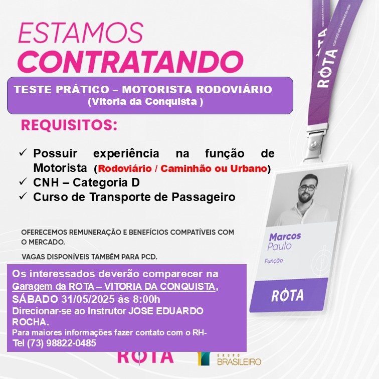 A Viação Rota, tradicional empresa de transporte rodoviário, está com vagas abertas para motoristas profissionais com Carteira Nacional de Habilitação (CNH) categoria D. As oportunidades são destinadas a candidatos das cidades de Vitória da Conquista, Barra do Choça e Itambé.