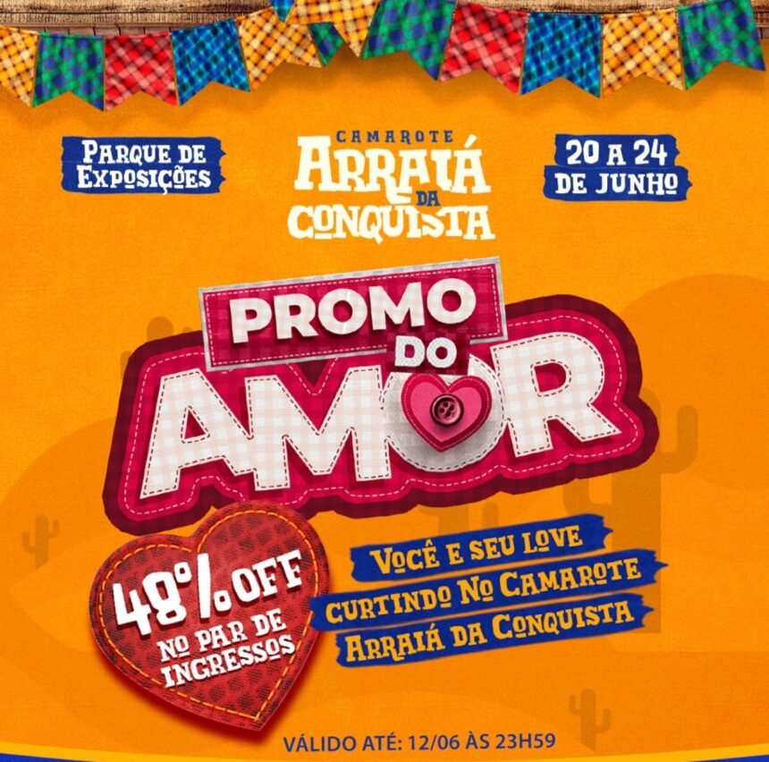O clima de romance e forró já está no ar em Vitória da Conquista. Para aquecer ainda mais o São João e celebrar o amor, o Camarote Arraiá da Conquista acaba de lançar uma promoção imperdível: a “Promo do Amor”, que oferece descontos de até 48% na compra de ingressos para duas pessoas. É a chance perfeita para você e seu “love” curtirem a festa junina mais esperada da região com todo o conforto e exclusividade.