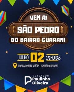 A cidade se prepara para viver momentos de pura animação, tradição e muito forró no São Pedro mais animado do ano, que acontece no próximo dia 02 de julho, a partir das 15h, na Praça Daniel Vieira, localizada no coração do Bairro Guarani.