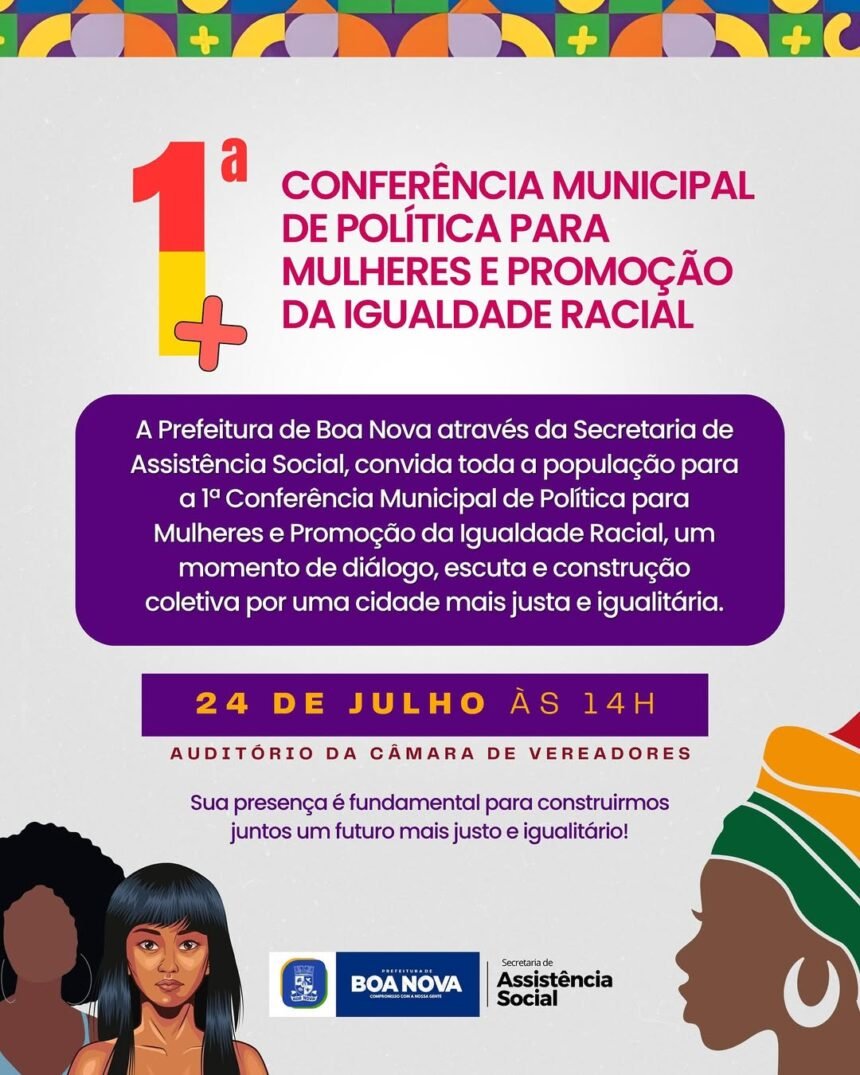 A gestão municipal de Vitória da Conquista convida toda a população para participar da 1ª Conferência Municipal de Política para as Mulheres e Promoção da Igualdade Racial, que será realizada nesta quinta-feira, 24 de julho de 2025, às 14h, no Auditório da Câmara de Vereadores.