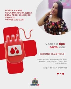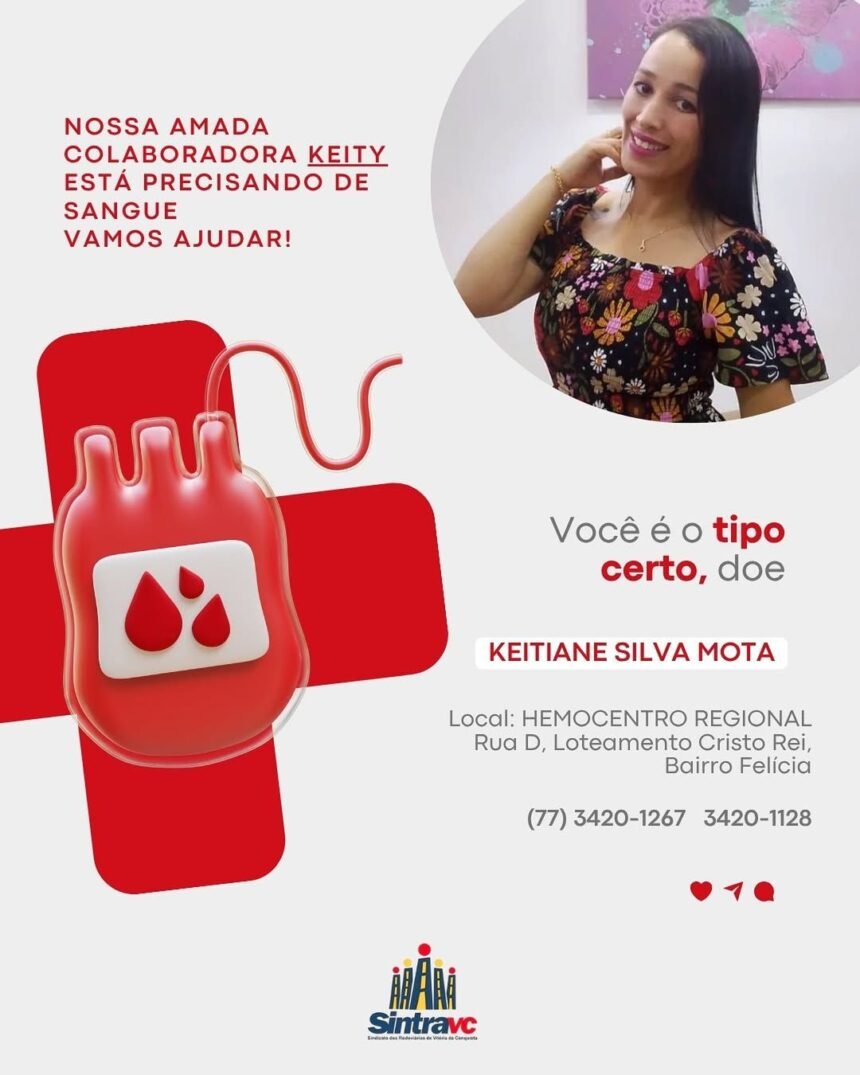 O Sindicato dos Rodoviários de Vitória da Conquista Sintravc divulgou um comunicado nesta quinta-feira alertando sobre o estado de saúde da colaboradora Keitiane Silva Mota, funcionária do transporte urbano municipal, que passa por um momento delicado e necessita com urgência de doações de sangue.