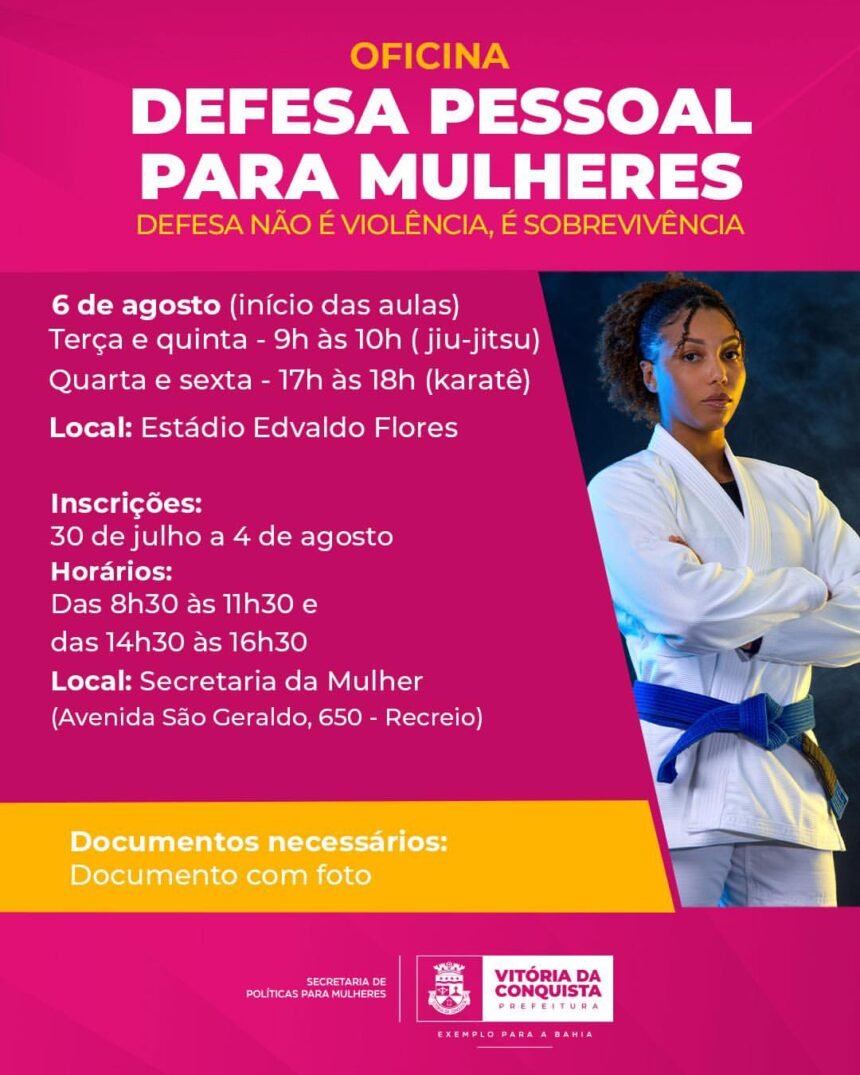 A partir do dia 6 de agosto, mulheres de Vitória da Conquista com 16 anos ou mais terão uma oportunidade gratuita para aprender técnicas de defesa pessoal. A iniciativa, promovida pela Secretaria da Mulher, busca fortalecer a autonomia e a segurança feminina por meio de aulas práticas que incluem fundamentos do jiu-jitsu, karatê e outras estratégias de autoproteção.