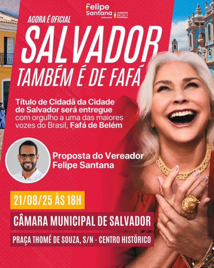 Segundo o vereador Felipe Santana, a homenagem é uma forma de expressar gratidão à artista que há décadas emociona o Brasil com sua voz e carisma. “Fafá de Belém não é apenas um ícone da música, mas também uma personalidade que leva alegria, identidade e força da nossa cultura para todos os cantos do país. Salvador agora também é de Fafá”, afirmou.