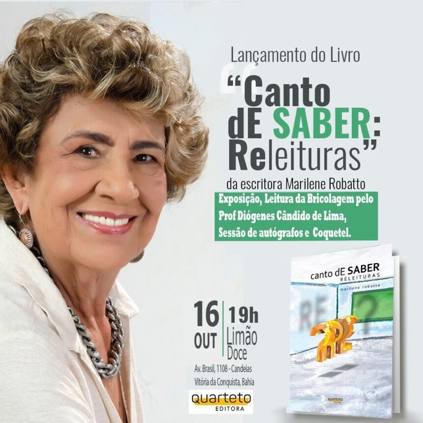 Após o lançamento em novembro de 2024 no Hotel da Bahia By Wish, em Salvador, a escritora baiana Marilene Robatto apresenta, em Vitória da Conquista, o seu livro “O Canto de Saber: Releituras”, obra memorialista e multimodal que se destaca pela estrutura não linear e polissêmica, refletindo a complexidade das relações entre natureza e sociedade.
