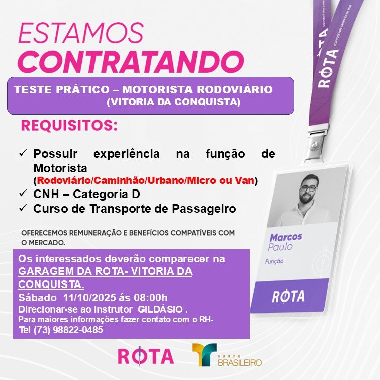 “Estamos em busca de profissionais qualificados, responsáveis e com vontade de crescer dentro da empresa. É uma excelente oportunidade para quem deseja ingressar ou se recolocar no mercado de trabalho”, destacou um representante da Viação Rota.