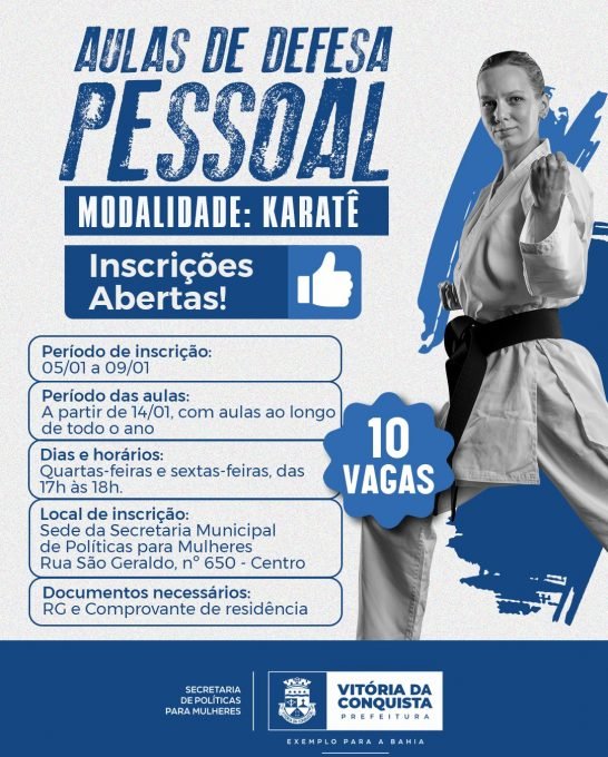 Com foco na ampliação das políticas públicas de proteção, autonomia e fortalecimento feminino, a Prefeitura de Vitória da Conquista iniciou as inscrições para aulas gratuitas de Defesa Pessoal, na modalidade karatê, destinadas exclusivamente a mulheres. A iniciativa é coordenada pela Secretaria Municipal de Políticas para Mulheres, em parceria com a Secretaria Municipal de Esportes, e integra um conjunto de ações voltadas à promoção da segurança e do empoderamento feminino no município.