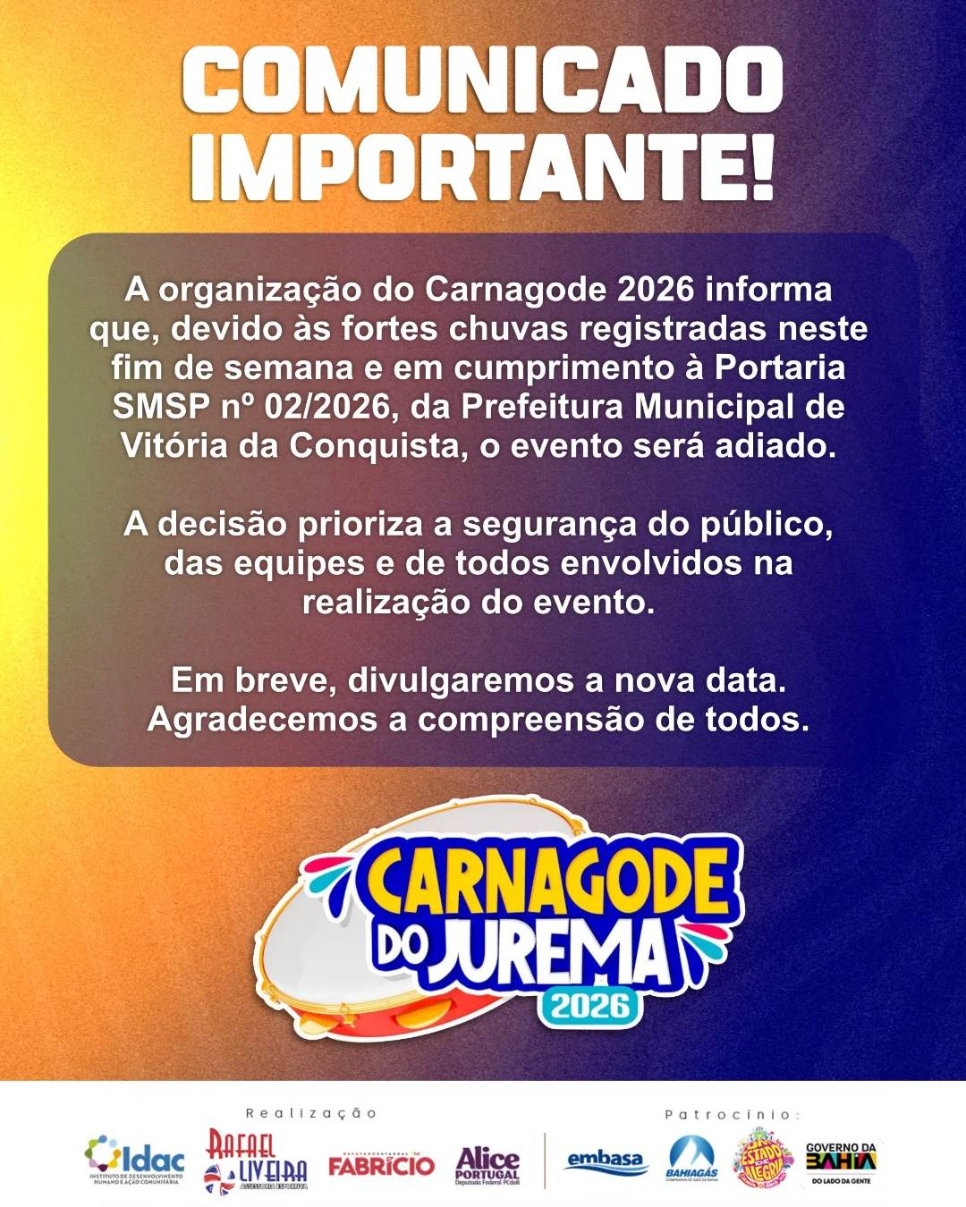 A organização do Carnagode do Jurema 2026 comunicou oficialmente, neste domingo, o adiamento do evento em razão das fortes chuvas registradas ao longo do fim de semana. A medida atende às determinações da Portaria SMSP nº 02/2026, emitida pela Prefeitura Municipal de Vitória da Conquista, que orienta a suspensão de atividades com grande concentração de público diante de riscos climáticos.