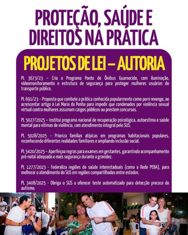 O deputado ressaltou ainda que a atuação parlamentar tem priorizado projetos e debates que tratam desde o combate à violência doméstica até o fortalecimento da assistência à saúde feminina. Entre os pontos defendidos estão a ampliação do acesso ao pré-natal de qualidade, o incentivo a políticas públicas voltadas à saúde mental das mulheres e a intensificação de programas de prevenção de doenças.