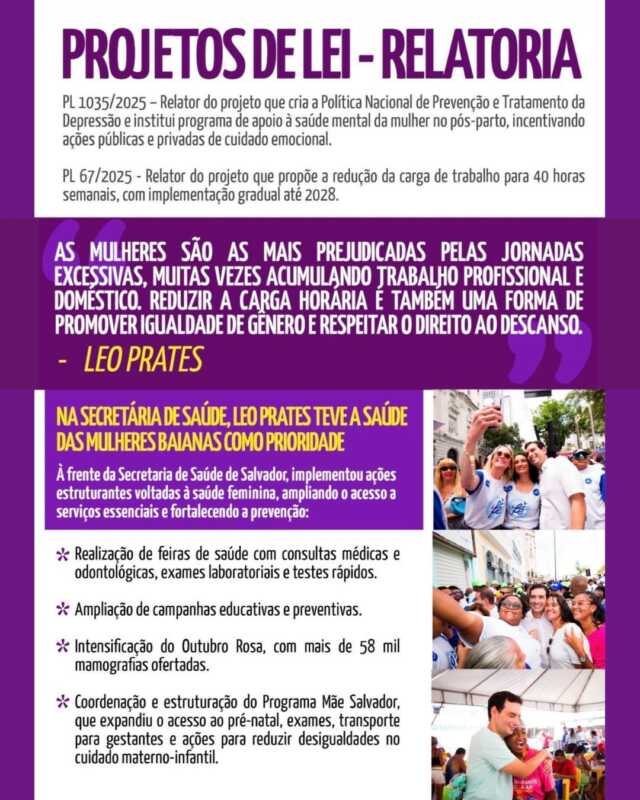 Segundo o deputado federal Léo Prates, o mandato que exerce na Câmara dos Deputados do Brasil tem buscado atuar diretamente na construção e no apoio a iniciativas que ampliem o acesso das mulheres à saúde, reforcem a rede de proteção social e promovam ações efetivas de enfrentamento à violência de gênero.