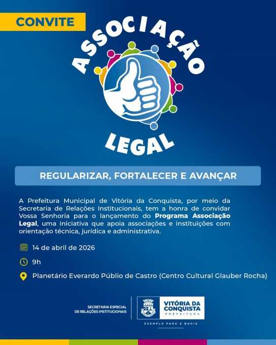 A Prefeitura de Vitória da Conquista, por meio da Secretaria Municipal de Relações Institucionais (Serin), realizará no próximo dia 14 de abril o lançamento oficial do Programa Associação Legal. A iniciativa surge como uma estratégia estruturante para apoiar a legalização, regularização e o fortalecimento das associações e demais instituições da sociedade civil no município. O evento acontecerá às 9h, no Planetário Municipal Everardo Públio de Castro, reunindo representantes do poder público, lideranças comunitárias e integrantes de organizações sociais.
