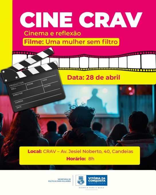Em Vitória da Conquista, o fortalecimento de políticas públicas voltadas às mulheres ganha mais um capítulo no próximo dia 28 de abril. O Centro de Referência da Mulher Albertina Vasconcelos (Crav) realiza, a partir das 8h, a terceira edição do CineCrav iniciativa que une cultura, informação e acolhimento em um mesmo espaço.