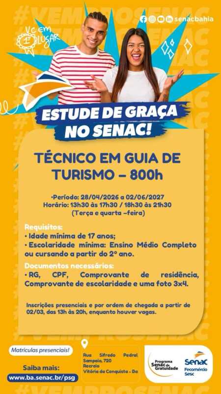 No dia 28 de abril, o SENAC promove o lançamento oficial do Curso Técnico em Guia de Turismo, iniciativa que surge como resposta direta às crescentes demandas do setor turístico regional e ao avanço do turismo como motor econômico.