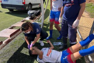 O Jogador do Bahia sofre colisão em campo e recebe atendimento imediato do Samu durante partida no Estádio Edvaldo Flores