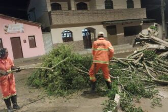 Vento forte derruba árvores e balança postes e caixas d’água em Vitória da Conquista.